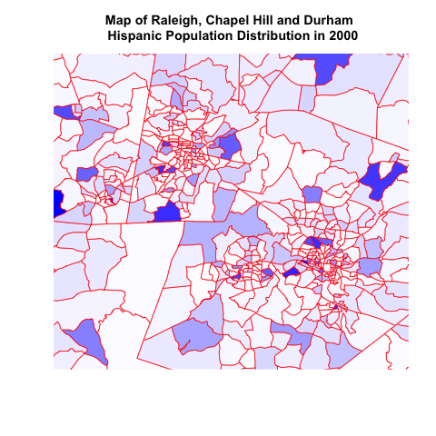 Image 5: Map of Raleigh, Chapel Hill and Durham on Hispanic Population Distribution in 2000 and 2010 |